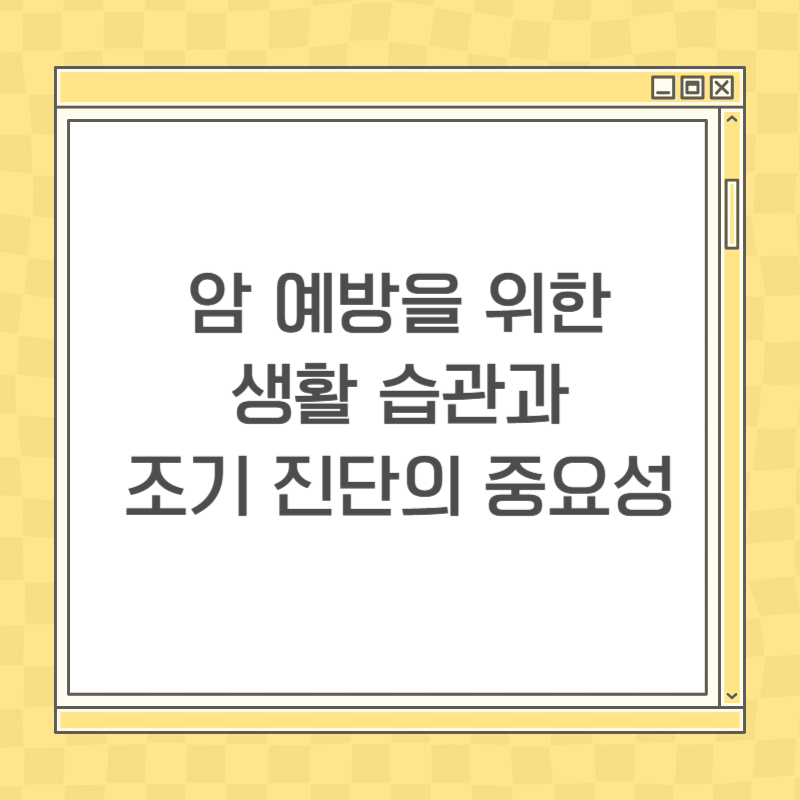 특히 암은 조기에 발견할수록 생존율이 높아지고 치료 효과가 크기 때문에, 사전 예방과 정기적인 검진이 필수입니다.
