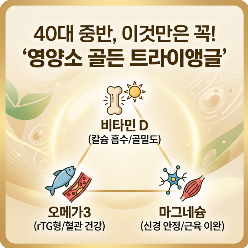 - 비타민 D, 오메가3, 마그네슘은 중년 여성의 뼈, 혈관, 신경 안정을 위한 '3대 필수 영양소'입니다.